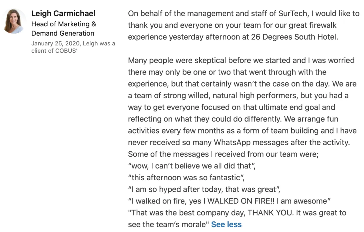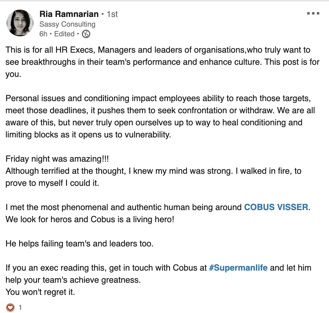 Today was absolutely incredible! The energy, the excitement, and the sense of achievement were beyond anything I expected. Walking on fire was a game-changer—yes, I WALKED ON FIRE! Seeing the team's morale so high was the best part. Thank you for an amazing day!